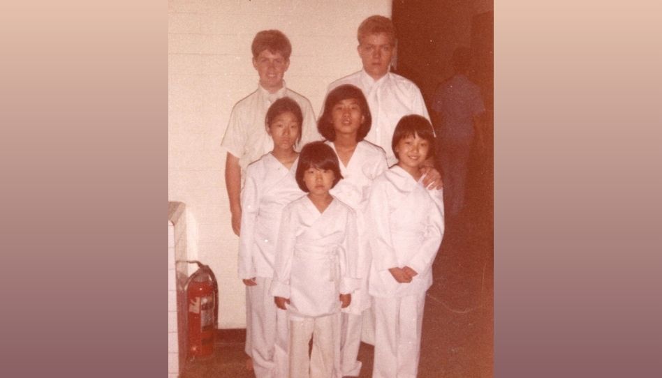 Élderes Kelly Wigington (à esquerda, na última fileira) e David McCubbins (à direita, na última fileira) com Sujin Kim (à direita, na frente) no dia de seu batismo, em 5 de julho de 1980.