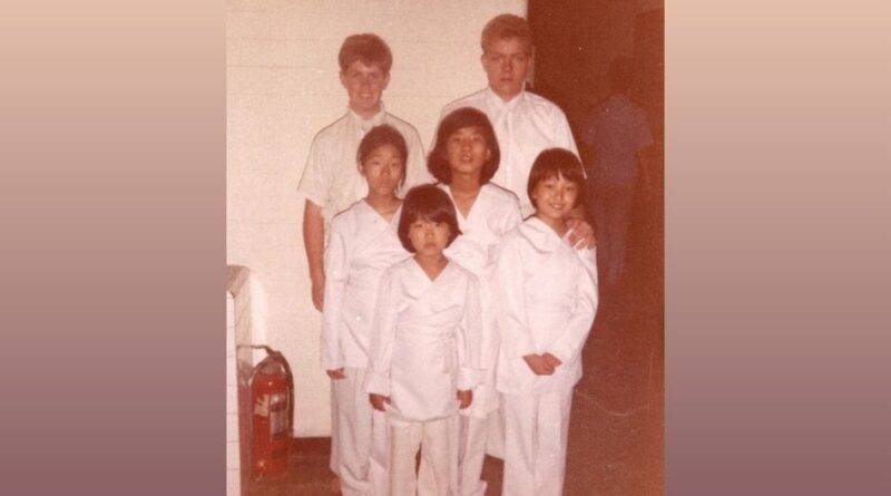 Élderes Kelly Wigington (à esquerda, na última fileira) e David McCubbins (à direita, na última fileira) com Sujin Kim (à direita, na frente) no dia de seu batismo, em 5 de julho de 1980.